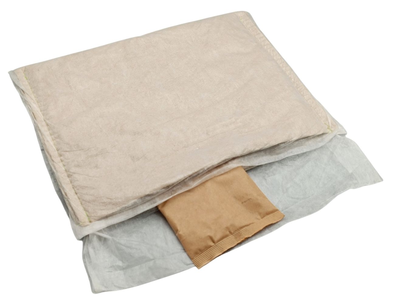Der Zellstoff hat als natürliches Material neben der Temperaturisolation und der Polsterfähigkeit übrigens noch die Eigenschaft, Feuchtigkeit aufzusaugen. Anfallende Flüssigkeit wird in der Tasche absorbiert und gerät nicht an anliegende Verpackungen.
