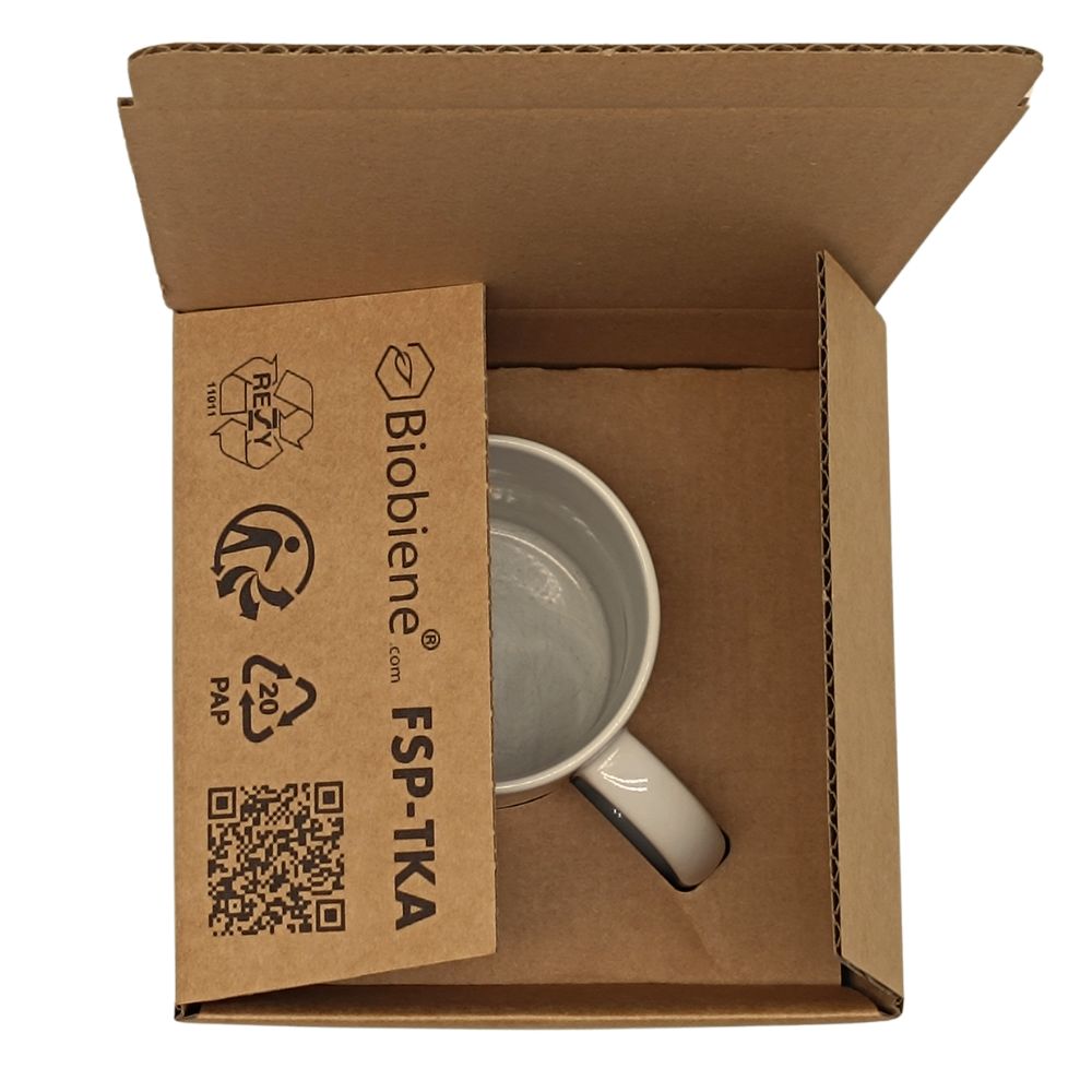 Päckchenkarton Magic (PS231610) 230x160x100mm einwellig Weiß Als Experte für praktisches und umweltfreundliches Verpackungsmaterial bieten wir den passend konzipierten Tassenkarton FSP-TKA speziell für den sicheren Versand von Tassen an. Diese hochwertige Verpackung hat das passende Format für alle gängigen Tassen mit Durchmesser 82 mm. Der stabile Wellpappkarton bietet dabei Platz für Tassen bis zu einer Höhe von 100 mm und ist damit ideal geeignet, Werbetassen, Logotassen und Fototassen sowie unbedrucktes Geschirr sicher zu verpacken. EIne passgenaue Verpackung ist unabdinglich, wenn sensible Waren wie Porzellantassen versandt werden sollen.