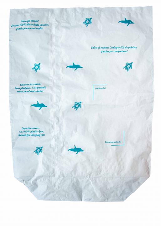 Jede Versandtasche ist eine Kampagne zur Rettung der Ozeane und ist mit dem Schriftzug "Rette die Ozeane! – Ich bin 100% frei von Plastik! Danke, dass du mich einkaufst!" In mehreren Sprachen und hat einen Delfin- und Schildkrötenaufdruck. Gerne unterbreiten wir Ihnen auch Angebote mit Spezialpreisen oder mit Ihrem Aufdruck auf dieser Versandtasche. (Je nach Abmessung 5000 bis 10000 Stück Mindestmenge)